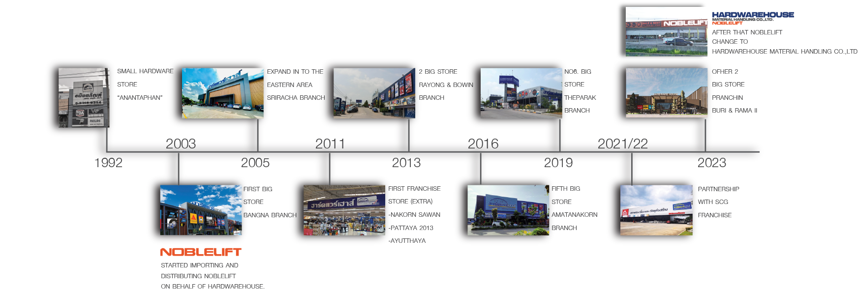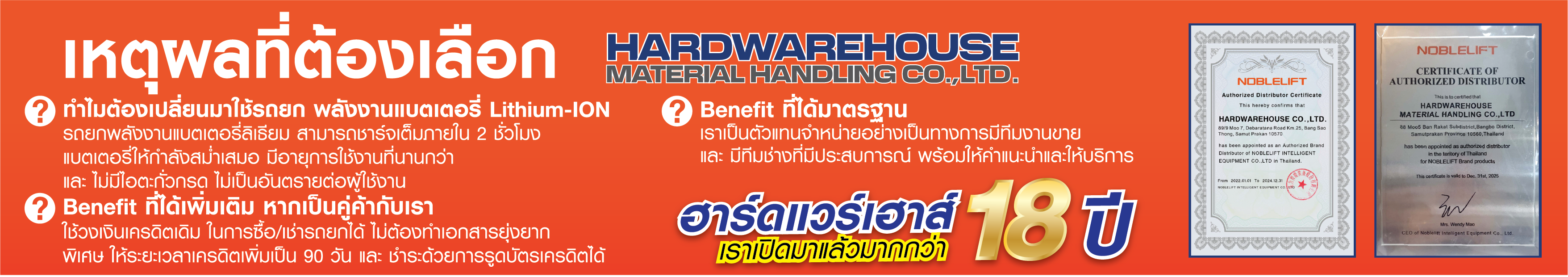 ฮาร์ดแวร์เฮาส์ (Hardwarehouse) ศูนย์รวมสินค้าช่าง-โรงงานสำหรับมืออาชีพ ได้เริ่มนำเข้าและจัดจำหน่ายโฟล์คลิฟท์ไฟฟ้า, แฮนด์ลิฟท์ต่าง ๆ ภายใต้แบรนด์ Noblelift โดยเริ่มวางจำหน่ายสินค้าเหล่านี้ภายในสาขาของฮาร์ดแวร์เฮาส์ในทุกสาขา ตั้งแต่ปี พ.ศ. 2546 และได้มีการขยายสาขาอย่างต่อเนื่อง จนในปี พ.ศ. 2566 ได้มีการจัดตั้งและจดทะเบียนบริษัทใหม่ขึ้นในนาม บริษัท ฮาร์ดแวร์เฮาส์ แมททีเรียล แฮนด์ดลิ่ง จำกัด เพื่อต้องการมุ่งเน้นในด้านเครื่องมือและเครื่องจักรสำหรับโรงงานอย่างจริงจังและปรับให้สอดรับกับเป้าหมายที่เติบโตอย่างต่อเนื่อง